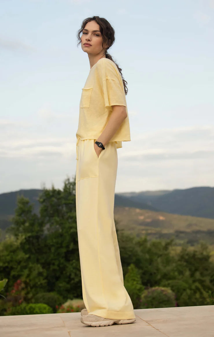 Made from soft baby french terry, these full length pants feature a wide leg, drawcord waistband, and side seam pockets. Pair with the Everyday Pocket Tee or World Tour Rib Tank for an easy outfit.
