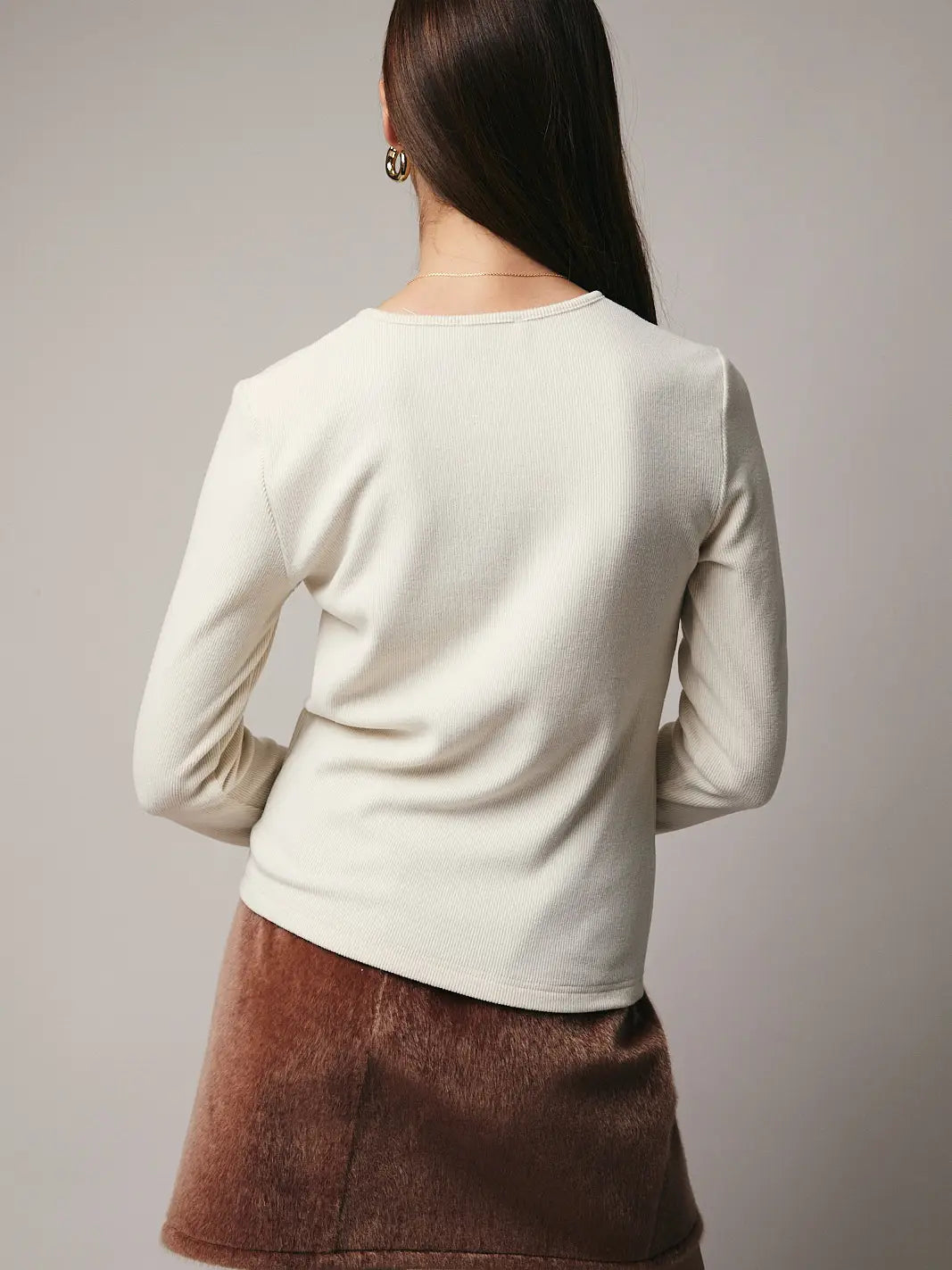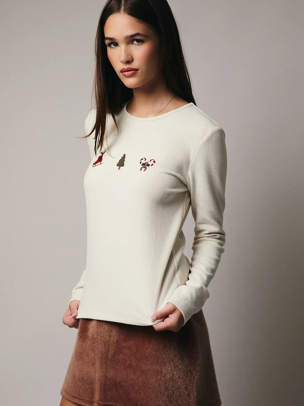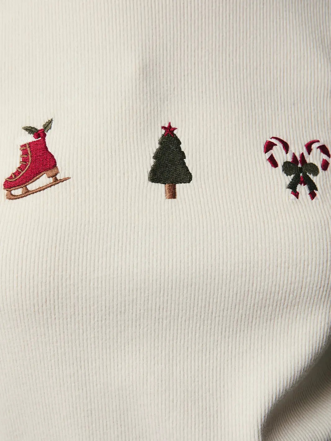 Wrap yourself in cozy winter vibes with this charming ribbed knit crew neck sweater in soft cream. The fitted ribbed texture adds timeless appeal, while delicate embroidered details—a graceful ice skate, festive Christmas tree, and candy canes—bring playful holiday spirit to your everyday look. Perfect for layering through the season or wearing solo on milder days, this long sleeve essential pairs effortlessly with jeans, skirts, or holiday outfits. A sweet way to celebrate the most wonderful time of year, whether you're hitting the slopes or sipping cocoa by the fire.