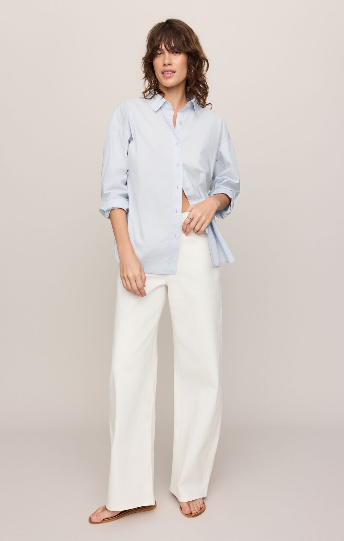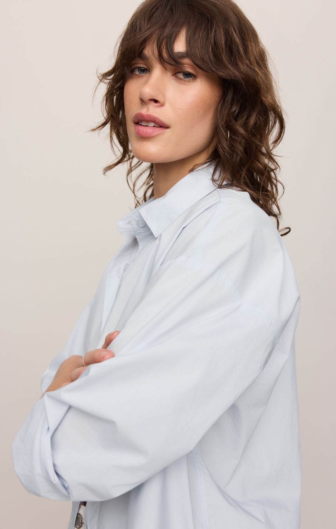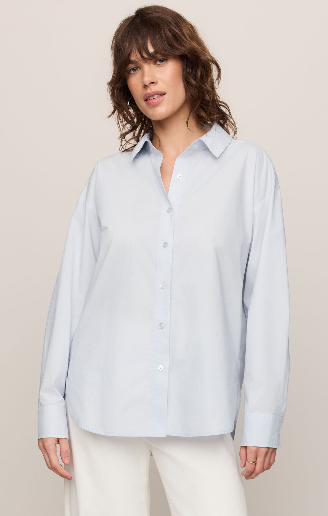 This poplin button-up brings structure to your wardrobe with a relaxed fit and lightweight, breathable cotton feel. The collared neckline and long sleeves make it ideal for dressing up or styling open over tanks.