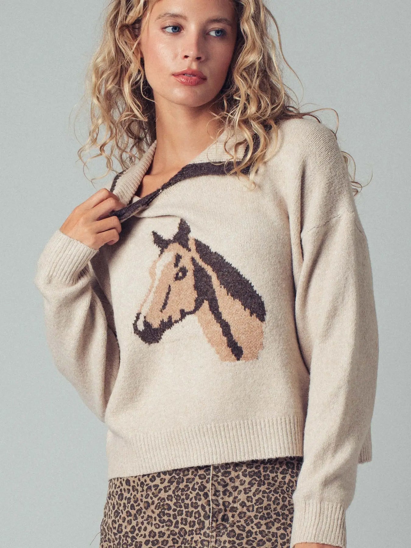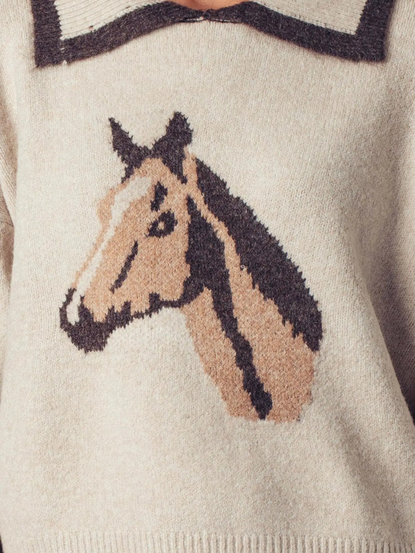 A must-have for any equestrian-inspired collection, this charming intarsia sweater is full of playful personality. Crafted from a soft and cozy knit, it features a large horse head graphic on the front that makes a bold statement. The unique, contrasting split collar detail adds a preppy, layered look that elevates this standout piece from casual to conversation-starter. Perfect for horse lovers and fashion enthusiasts alike.