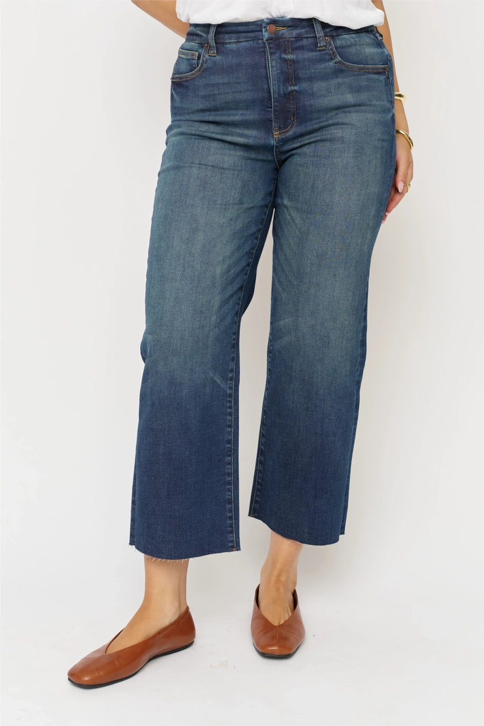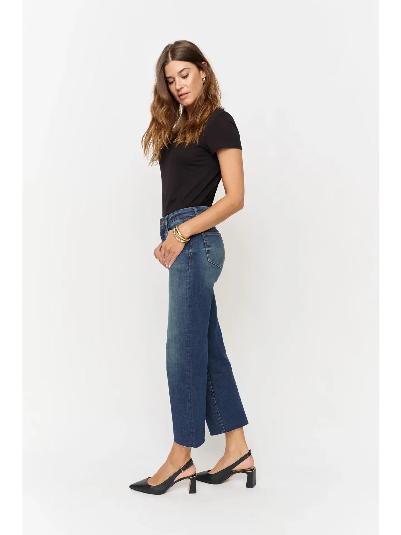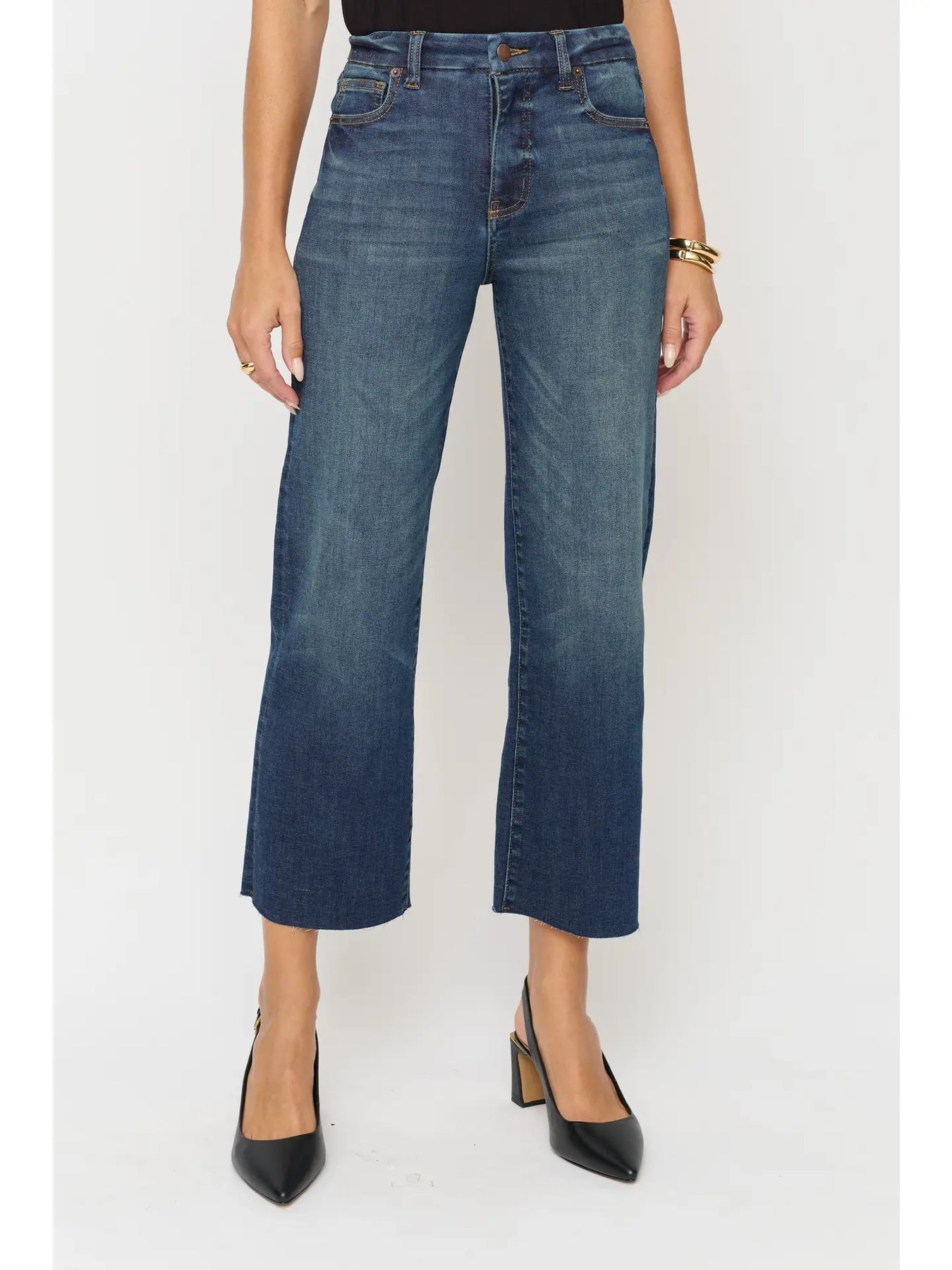 THE FIT: High rise, fitted through the hip, zipper fly, wide leg, and a cropped raw hem. • Designed with a smooth, flat waistband, stay-put pockets, and just the right stretch for a held-in, sculpted feel. Sculpt+ stretch fabric moves with you but always bounces back. No sagging, no stretching out. Cropped length hits just above the ankle