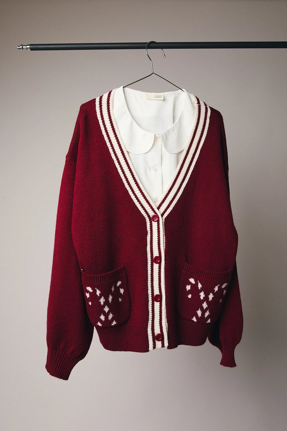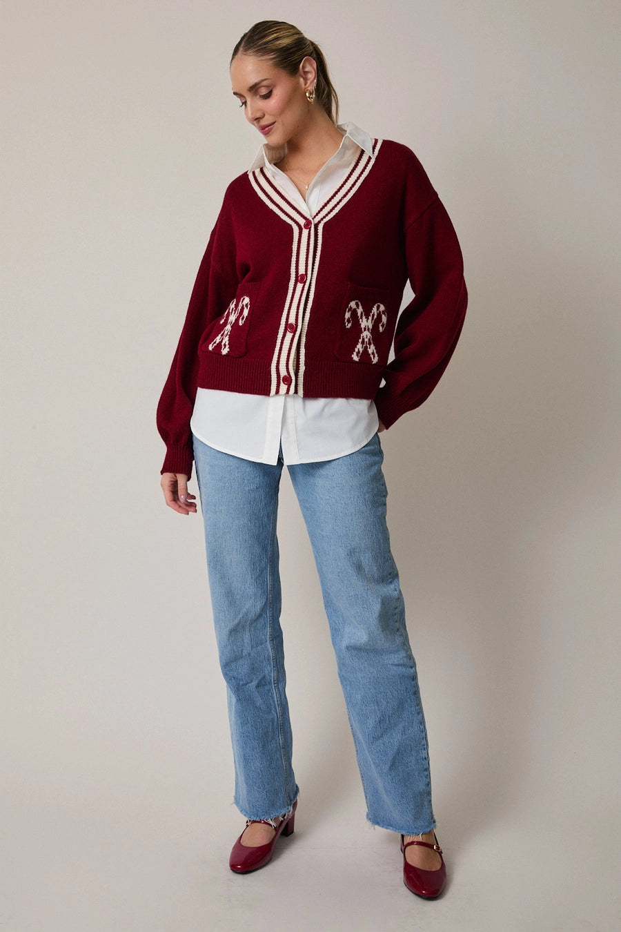 This playful Candy Cane Varsity Cardigan brings festive fun to your wardrobe with its rich burgundy hue and crisp ivory varsity stripes along the edges. Featuring a cozy V-neck and long sleeves, it’s perfect for layering on chilly days. The classic button closure adds a charming touch, making it easy to mix and match with your favorite casual looks. Celebrate the season in style and comfort!