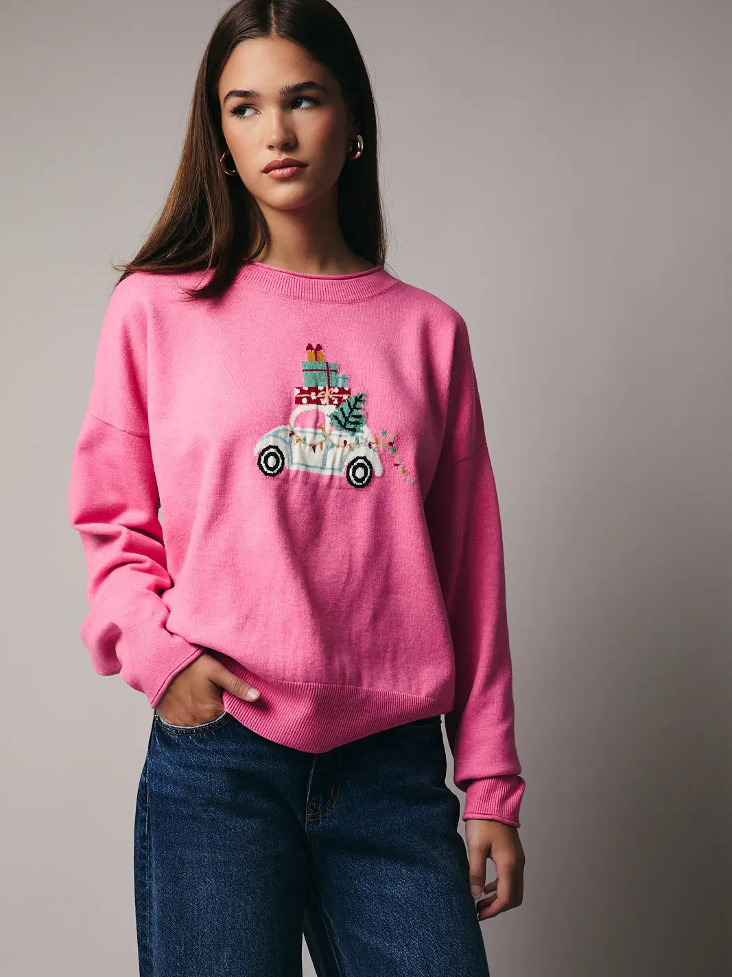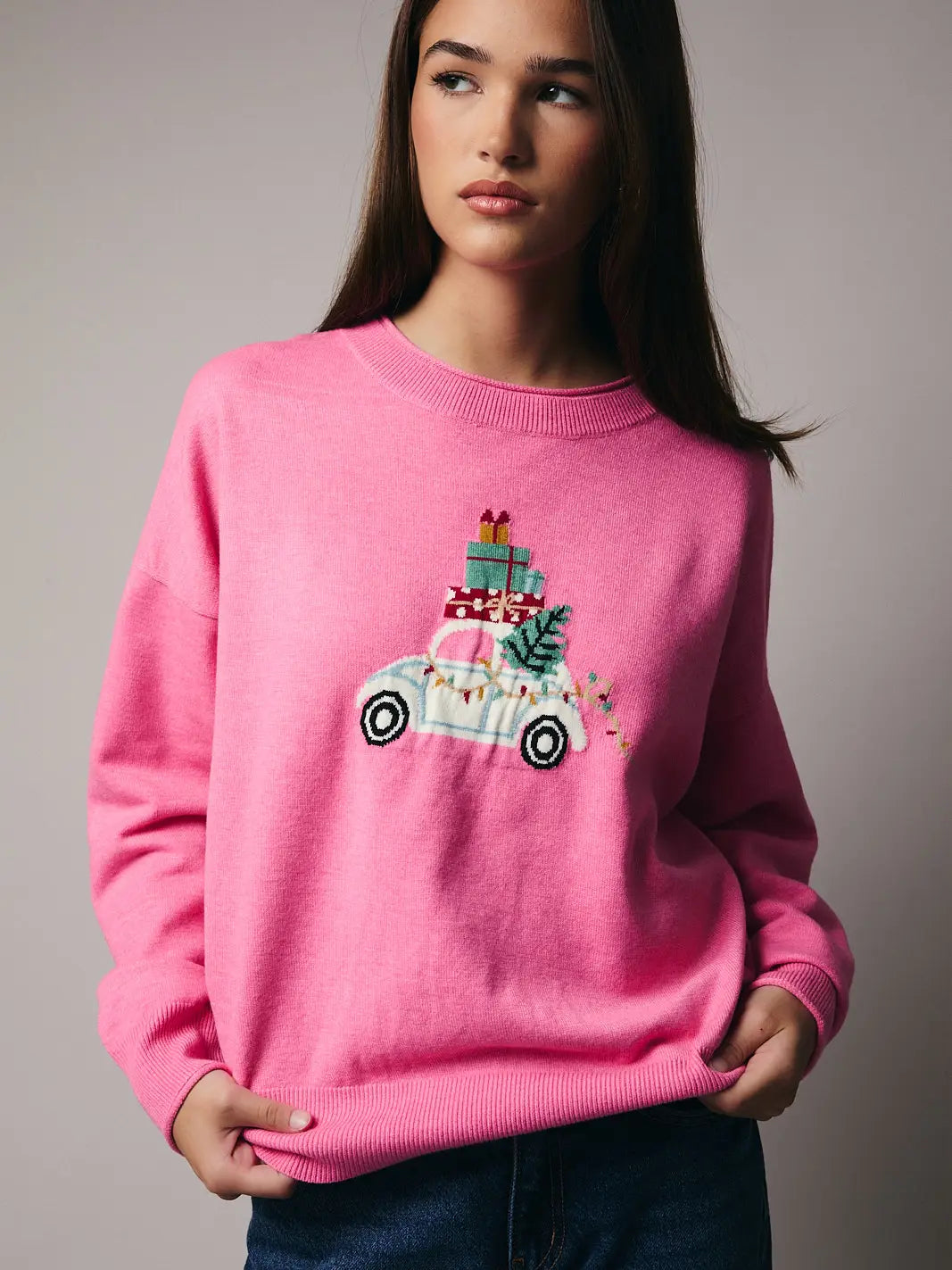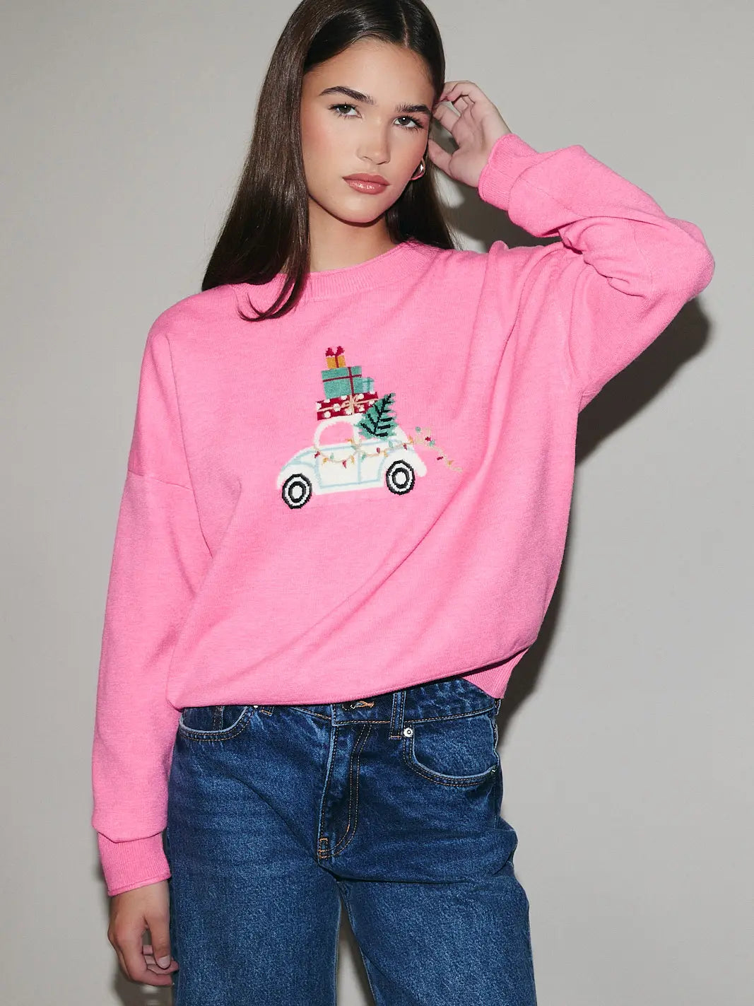 Celebrate the festive season in style with this playful pink crew neck sweater, featuring a charming classic white VW Bug piled high with Christmas presents and a decorated tree. Cozy and colorful, it’s perfect for spreading holiday cheer and adding a fun twist to your winter wardrobe.