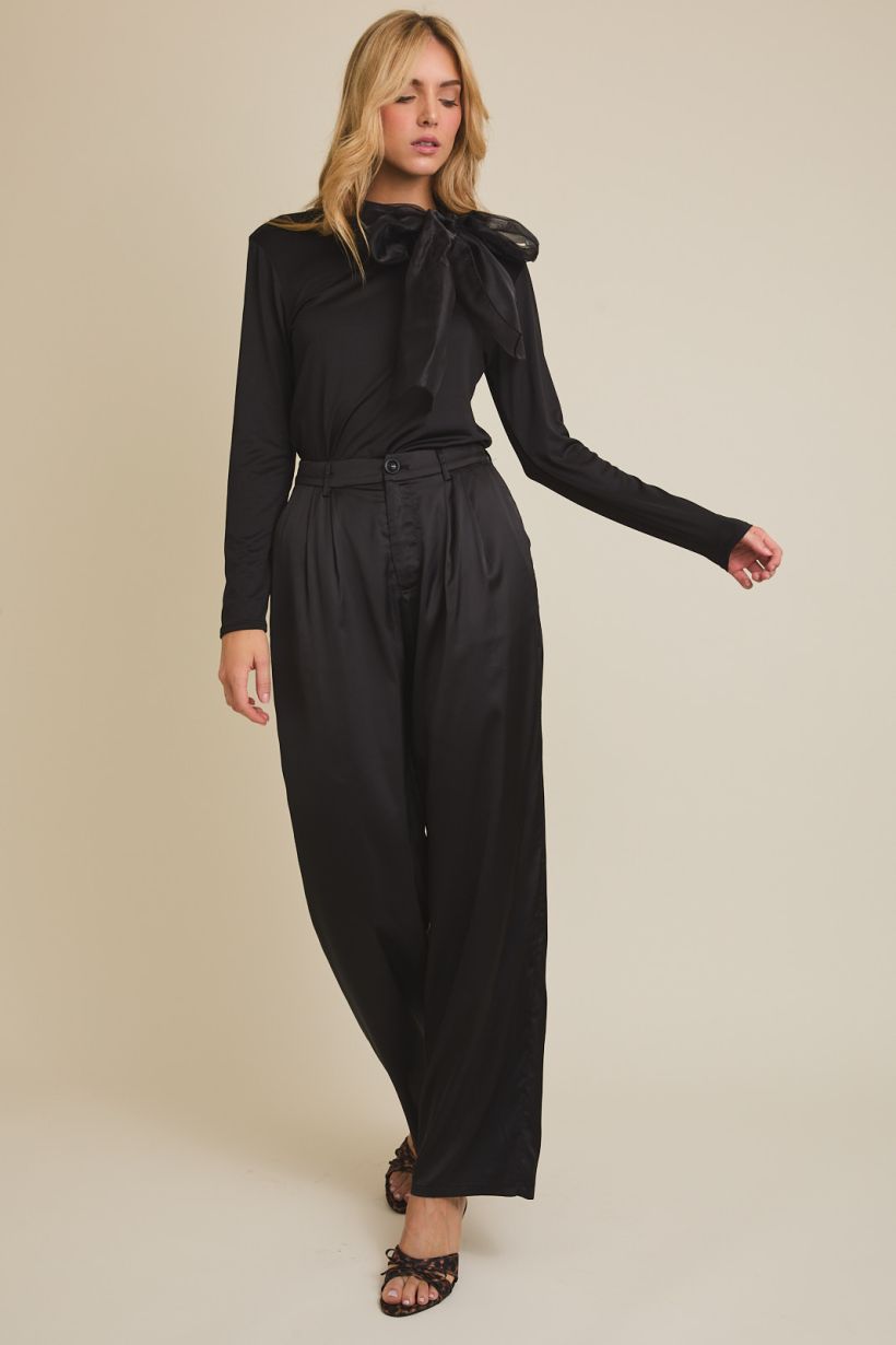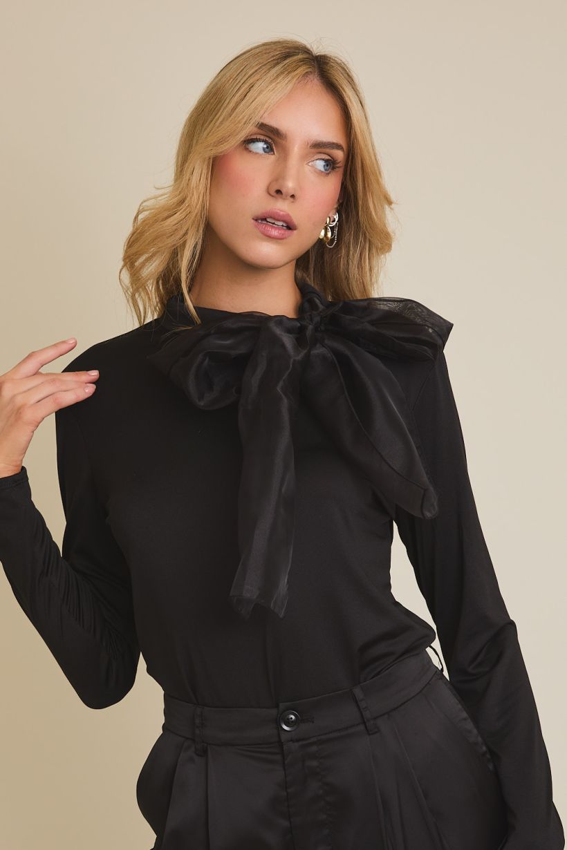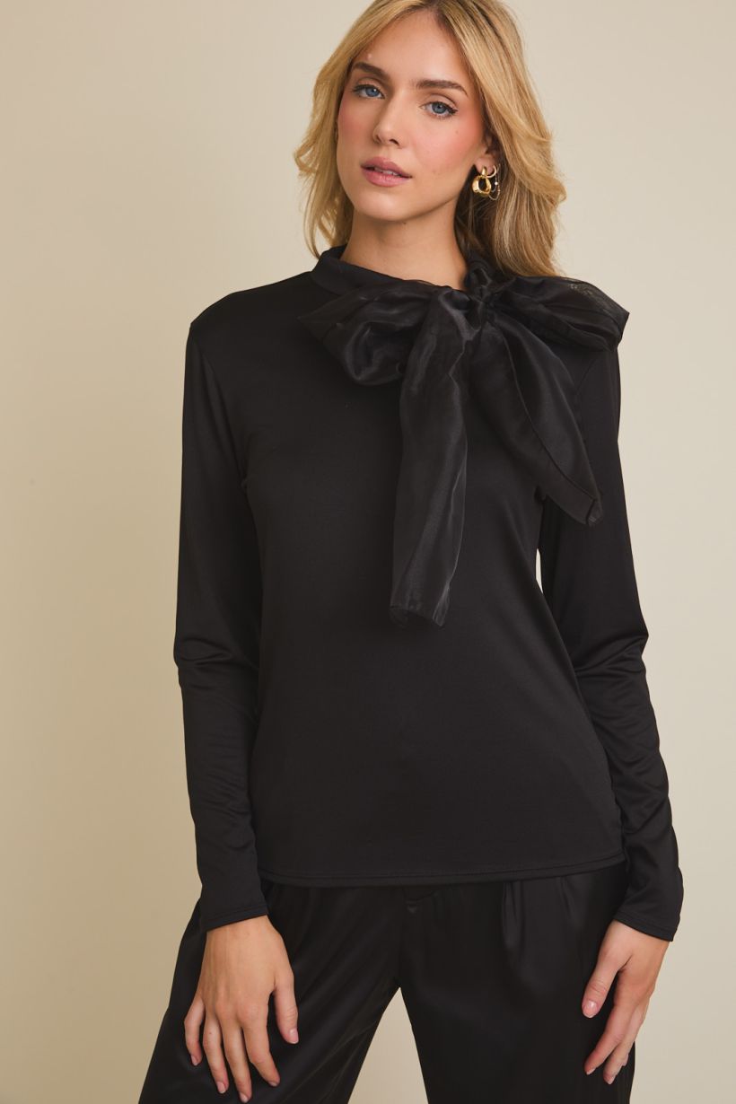 Elevate your style with this playful black mock neck blouse, featuring long sleeves and a charming bow detail at the neckline. Perfectly designed to effortlessly transition from your desk to a date night, it adds a touch of fun sophistication to any outfit.