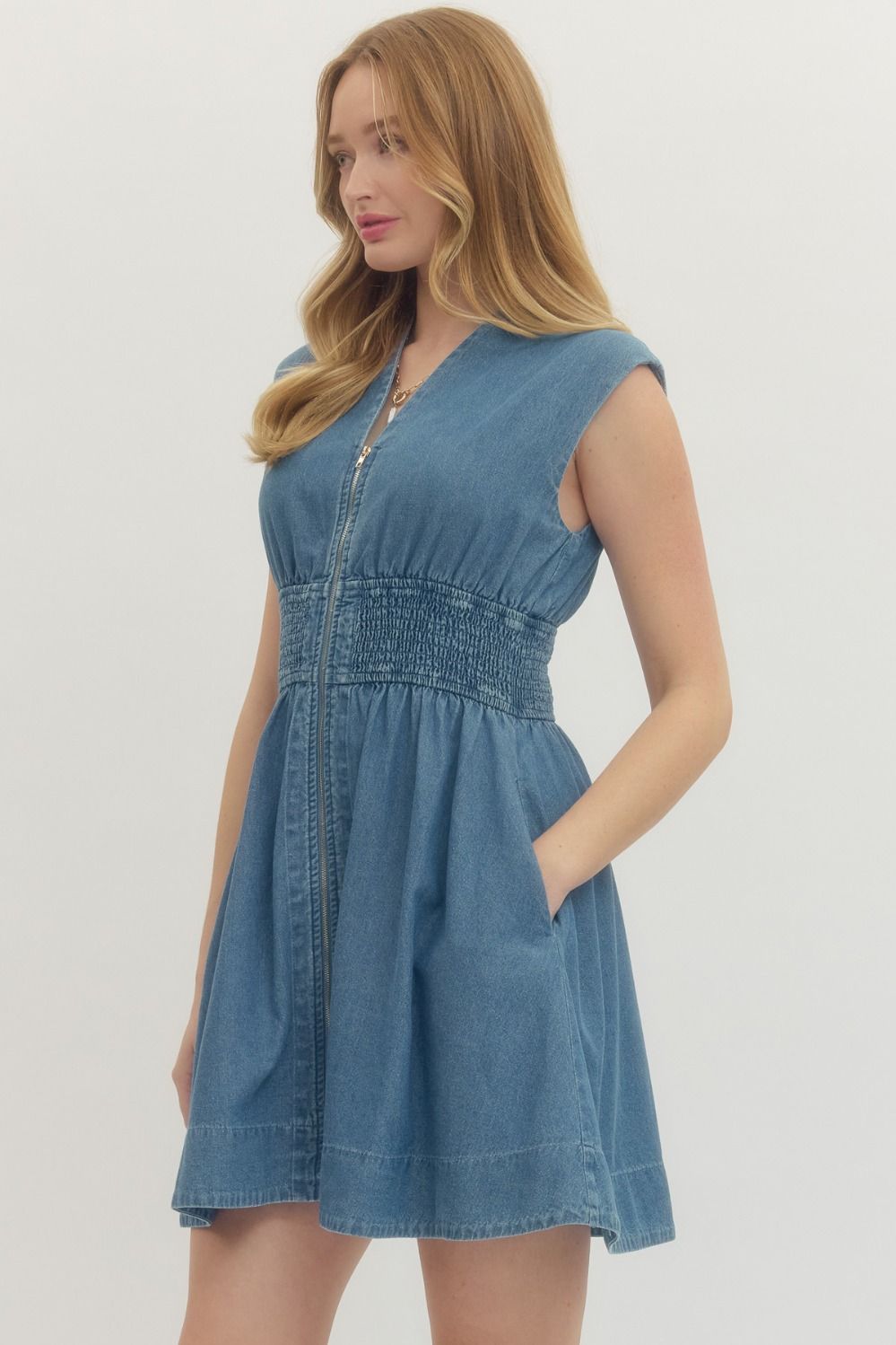 Rock a laid-back vibe in this Willow Denim Mini—a sleek sleeveless dress that's ready for anything. The front zip closure makes getting dressed effortless, while the smocked waist cinches you in just right. Side pocket? Check. Perfect for casual days, weekend adventures, or throwing on over a tee for extra edge. Denim done right.